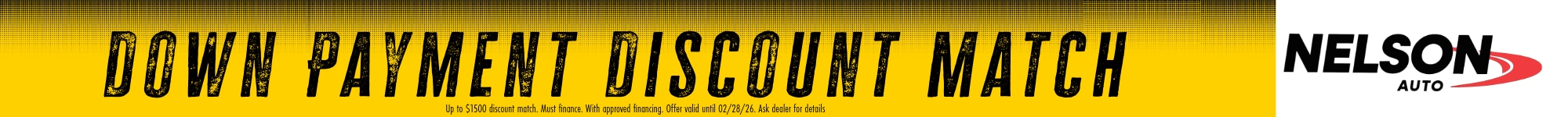 All NEW and USED get up to $1500 DOWN PAYMENT DISCOUNT MATCH on all financed vehicles. Call 701-757-6301 for detail. Get the service you DESERVE only at NELSON AUTO of GRAND FORKS. .